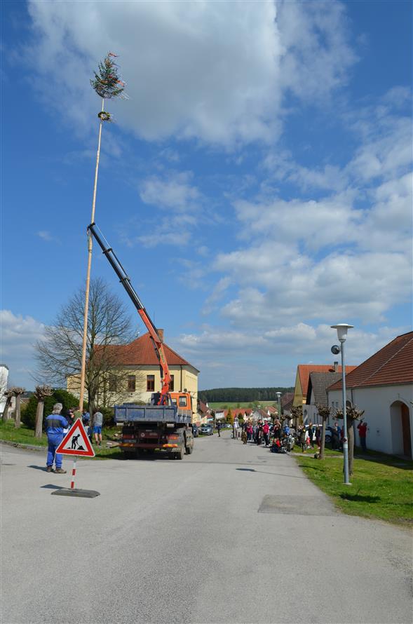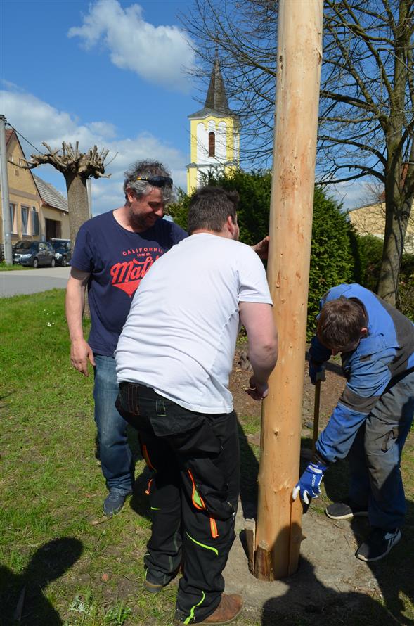Poté se v den stavění máje sešly dívky, které ozdobily špičku a věnec máje. Ozdobená máj se pomocí techniky vztyčila nad naši obec.