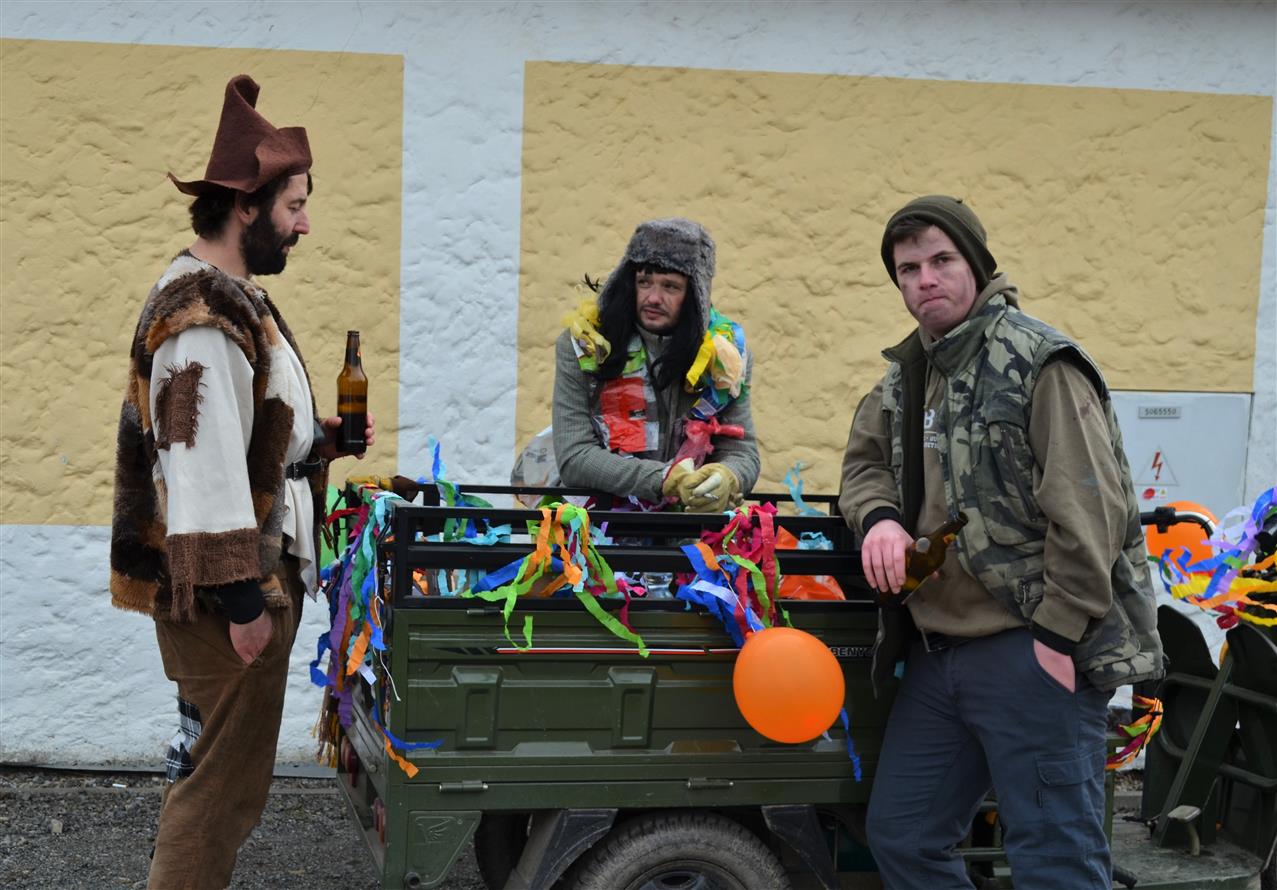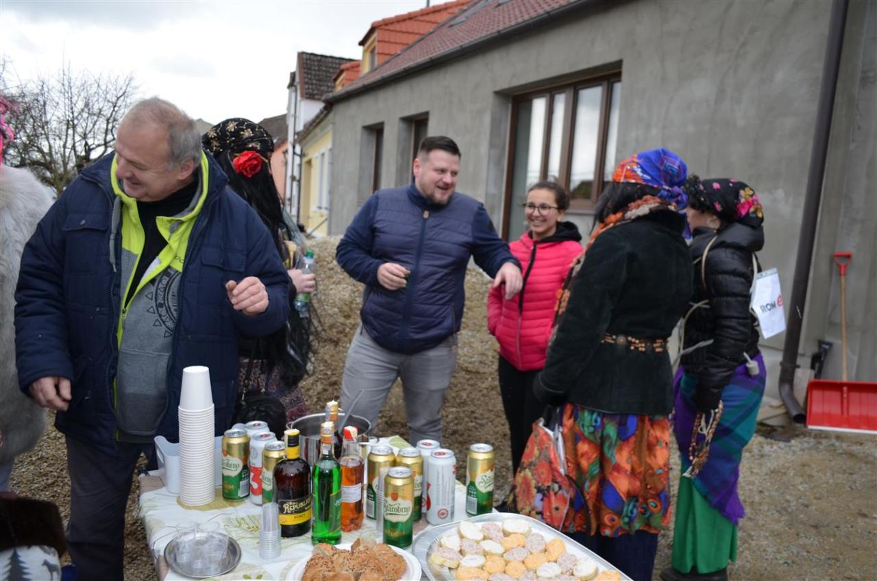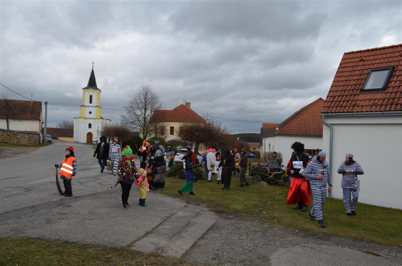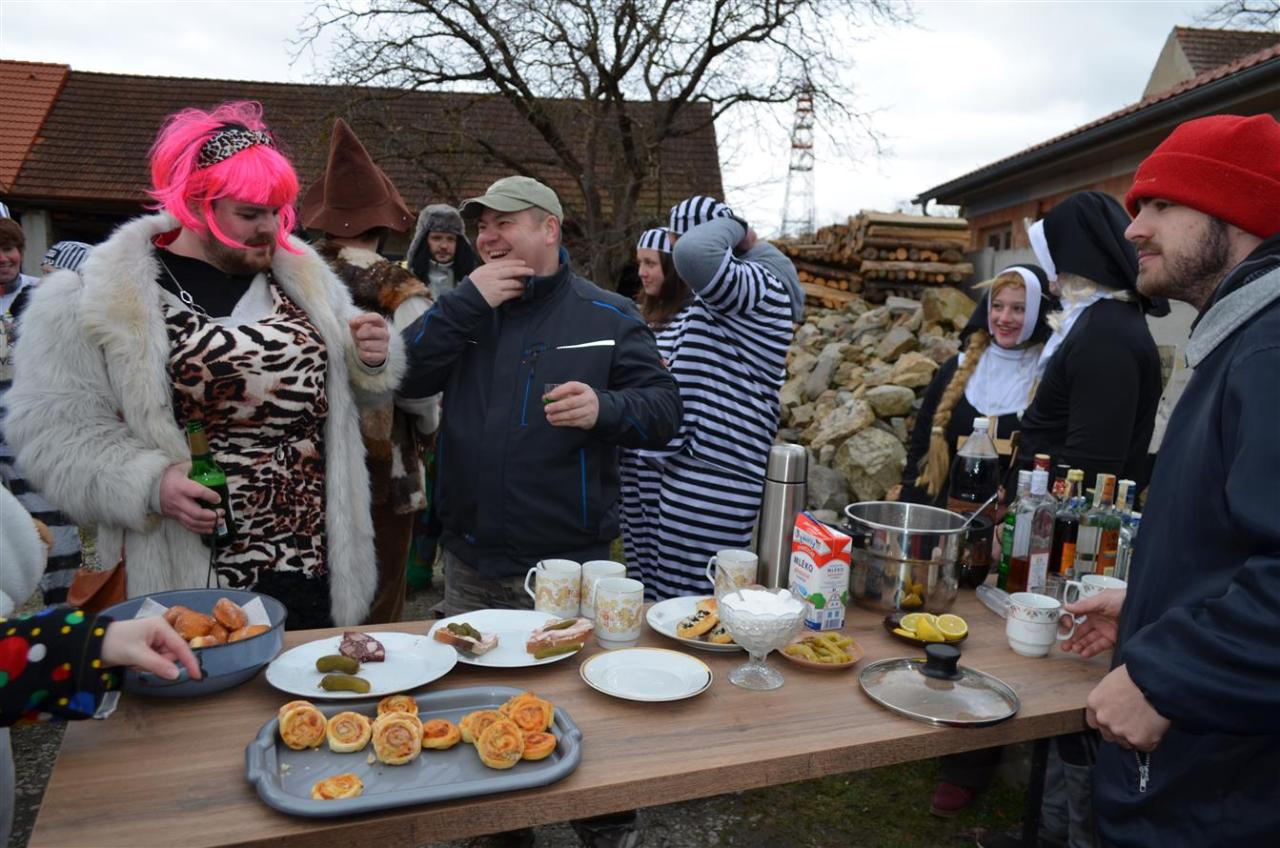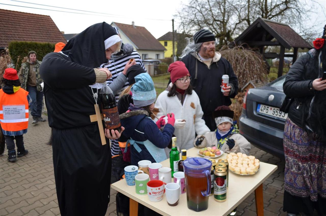 Maškary se pak vydaly na společnou obchůzku obcí krátce po 10 hodině. Masopustní průvod doprovodili na harmoniku Dan Gruberů a na vozembouch Jirka Churáček ml. Masky i jejich doprovod se mohly po cestě těšit na drobné občerstvení. Snad v každé chalupě, u které se maškary zastavily a zazpívaly, dostaly koblihy, koláčky nebo bramboráčky, někde i guláš.